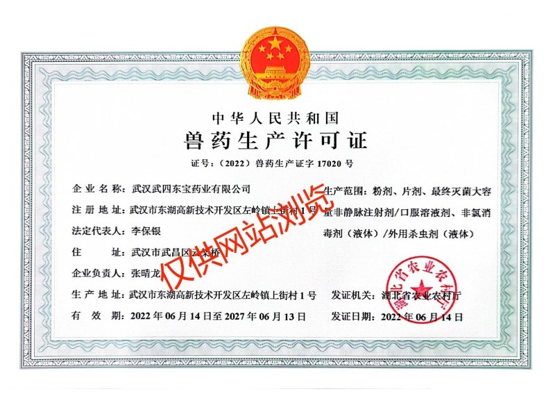 武漢武四東寶藥業有限公司,是在原武昌獸藥廠(成立于1972年)基礎上發展而來,公司位于武漢市東湖新技術開發區左嶺工業園,是一家專業從事動物保健品的研發、生產、銷售和服務于一體的高新技術企業,目前擁有六條生產線、十種劑型(最終滅菌小容量注射劑、最終滅菌大容量非靜脈注射劑、口服溶液劑、粉劑、預混劑、固體殺蟲劑、液體殺蟲劑、片劑、顆粒劑、液體消毒劑)。公司成立于2004年,2006年全面通過國家農業部獸藥GMP認證,已成為中國獸用保健行業知名企業之一。武漢武四東寶藥業有限公司自創建以來,一直秉承著“善、行、學、成”的核心價值觀,恪守“一切為了健康養殖”的企業使命,堅持“科技成就價值,服務創造未來”的服務理念,經過多年不斷的創新與發展,逐步形成了自己的核心競爭力,并在行業中脫穎而出。公司與中國農業大學、華中農業大學、武漢工程大學、武漢工業學院、中科院水生所等全國知名院校和科研院所建立了長期密切的合作關系,通過聯合攻關和技術引進等方式,研發出50多種優質、高效、穩定的產品,并深得廣大用戶的認可與信賴。公司以“追求健康的用戶群體和卓越市場占有率”為經營理念,堅持以市場為導向,強化科技創新,拓展產品結構,努力為我國健康養殖事業的發展作出更大的貢獻!